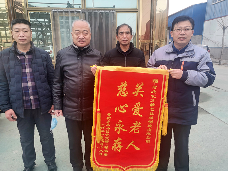 ? ? ? ? 近日,香坊鄉(xiāng)東馬村村長(zhǎng)及黨支部書記等一行三人將書有“關(guān)愛(ài)老人,慈心永存”的錦旗送至河北北方精藝機(jī)械制造有限公司總經(jīng)理馬風(fēng)順先生手中,以表達(dá)該村村民對(duì)北方精藝愛(ài)心捐物的善舉表示感激之情。
